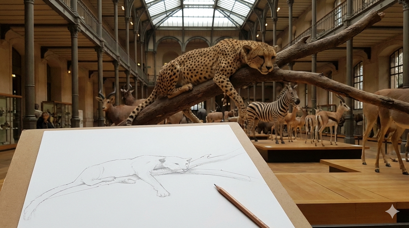 Réalisé sur le vif au cœur des galeries du Muséum, ce croquis rapide met en scène un guépard alangui, reposant sur une branche. Le travail s’attache à capter la souplesse féline et la sérénité de l’animal, dans une pose emblématique des grands prédateurs au repos.