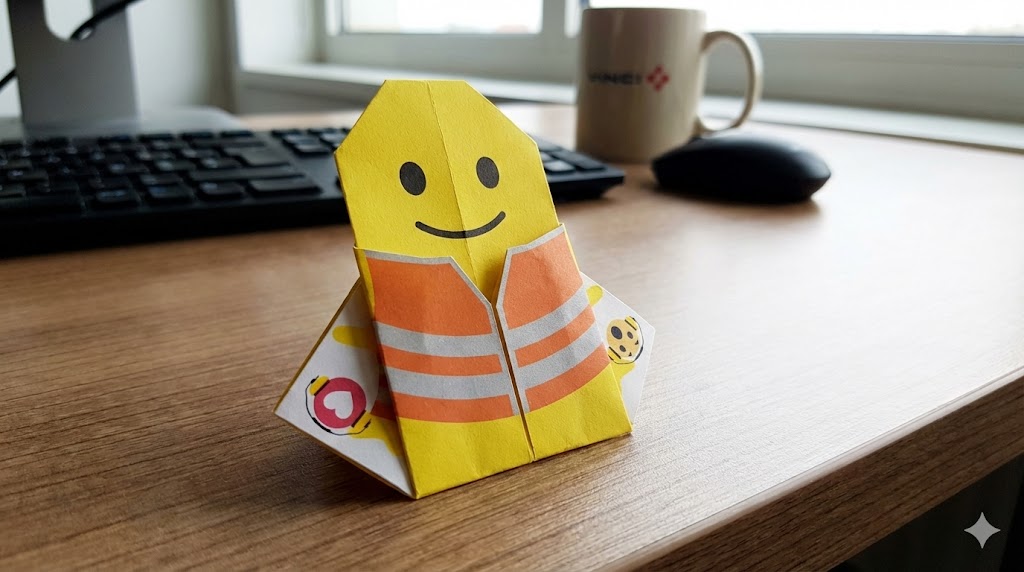 L’origami, choix iconographique audacieux, est ici utilisé comme métaphore de la construction : chaque pli représente une étape, une expertise, un savoir-faire. Le rendu final évoque l’assemblage rigoureux de compétences multiples — exactement comme sur un chantier complexe.