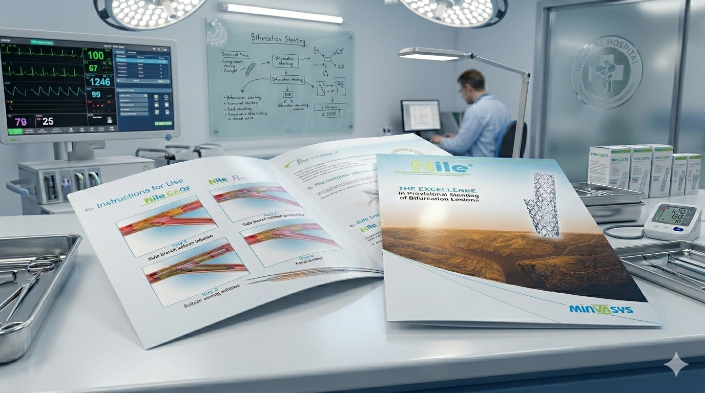 As part of Minvasys’ product communication strategy, Dragon Studio designed a 6-panel fold-out brochure dedicated to their medical device Nile, developed for provisional stenting of coronary bifurcation lesions in interventional cardiology.