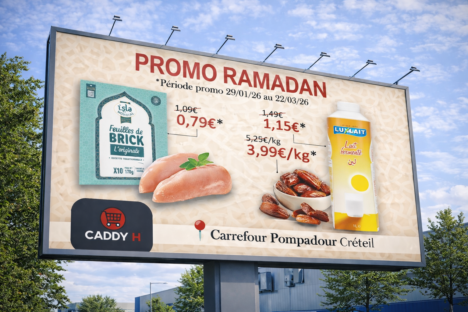 À l’occasion du Ramadan, période clé pour le commerce alimentaire, Caddy H a confié à Dragon Studio la conception d’une affiche promotionnelle destinée à valoriser une sélection de produits phares et les offres en magasin.
