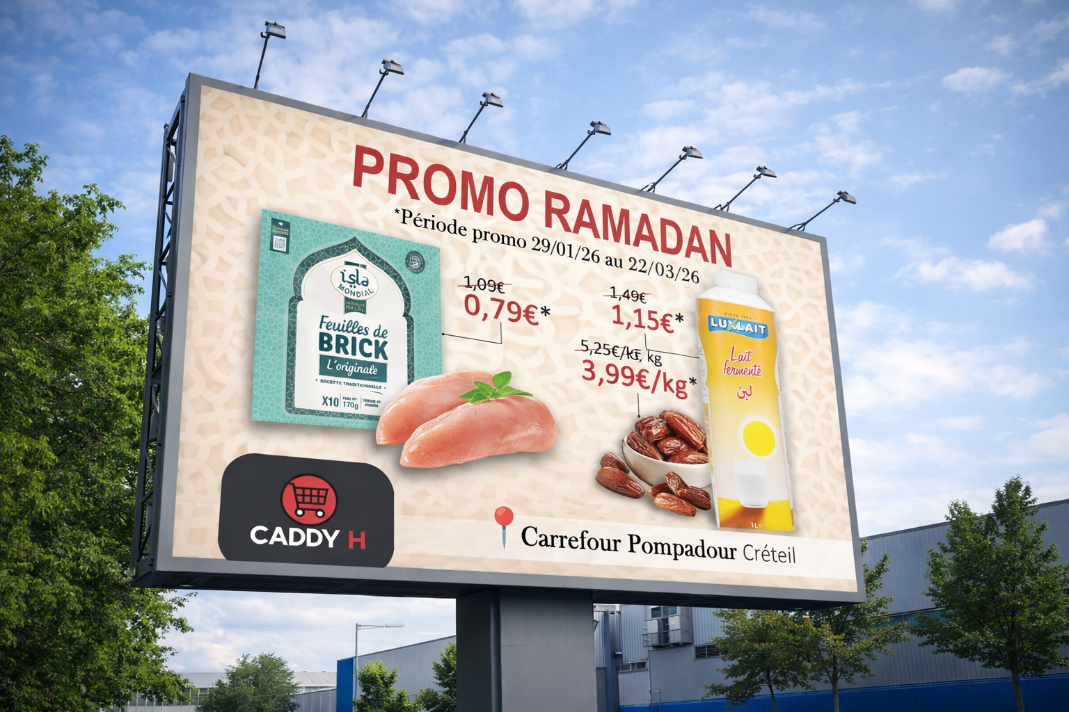 À l’occasion du Ramadan, période clé pour le commerce alimentaire, Caddy H a confié à Dragon Studio la conception d’une affiche promotionnelle destinée à valoriser une sélection de produits phares et les offres en magasin.